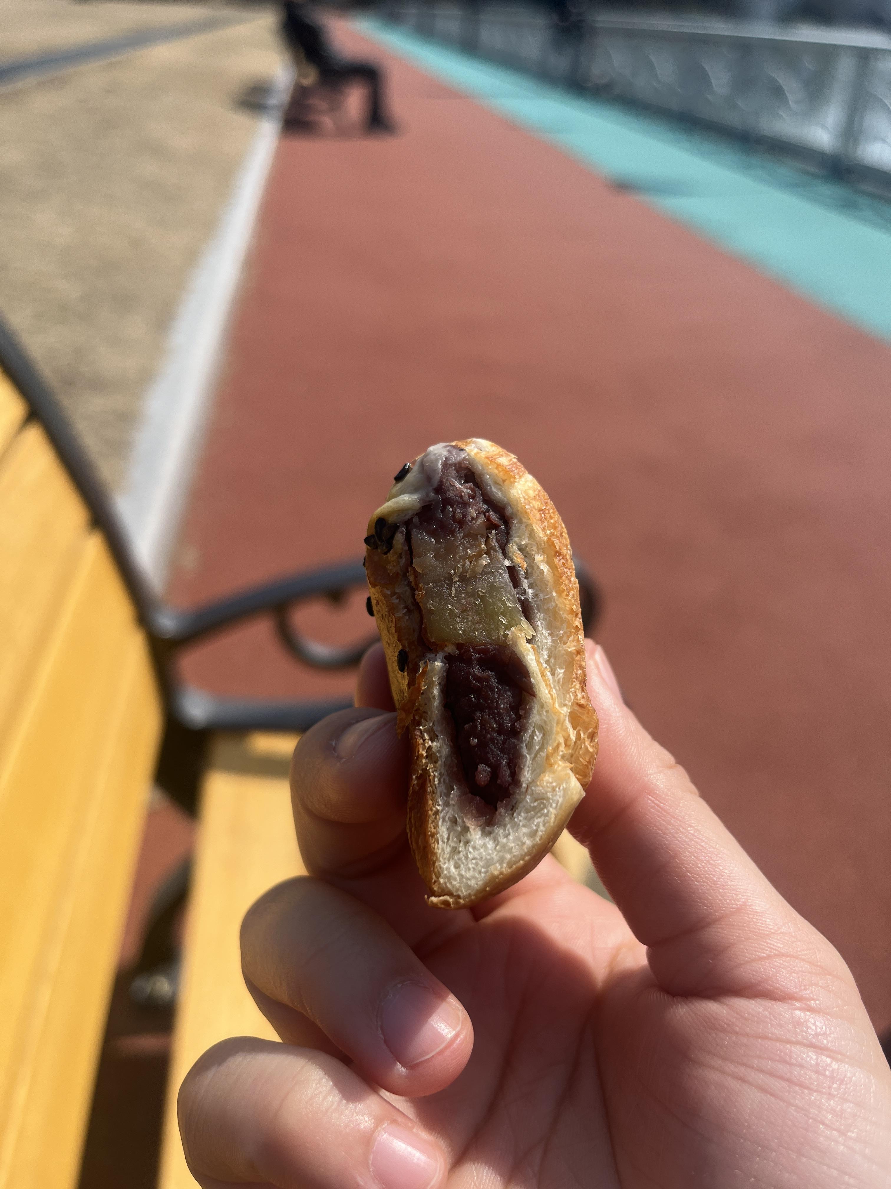 공원산책하다가 바로 단팥빵 입에 넣는데 오-와~